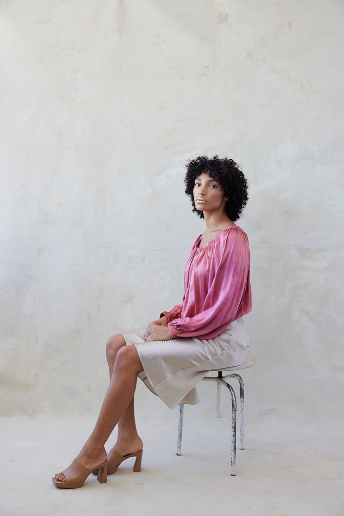 Show off your style our gorgeous Camille Blouse Sunset. Made with luxurious silk and naturally dyed with cochineal and marigold for a stunning sunrise effect, this handcrafted top will add a vibrant splash of sunshine to any look. Made in California