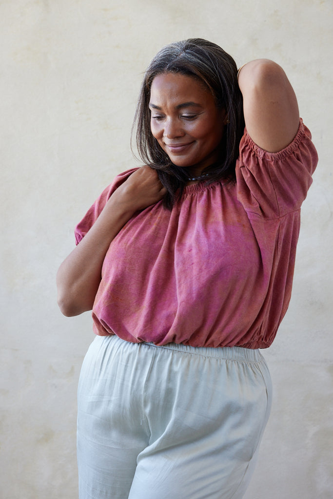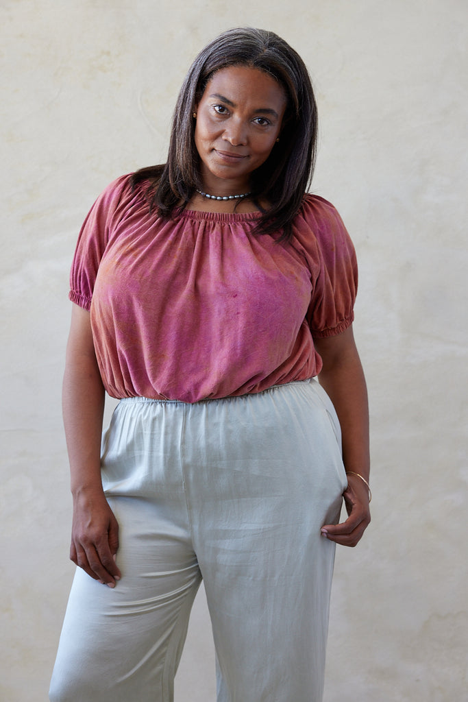Show off your style our gorgeous Camille Blouse Sunset. Made with luxurious silk noilsilk and naturally dyed with cochineal and marigold for a stunning sunrise effect, this handcrafted top will add a vibrant splash of sunshine to any look. Made in California