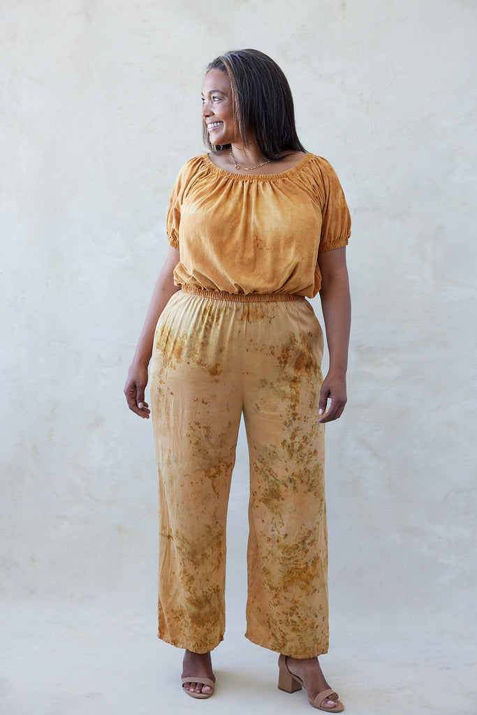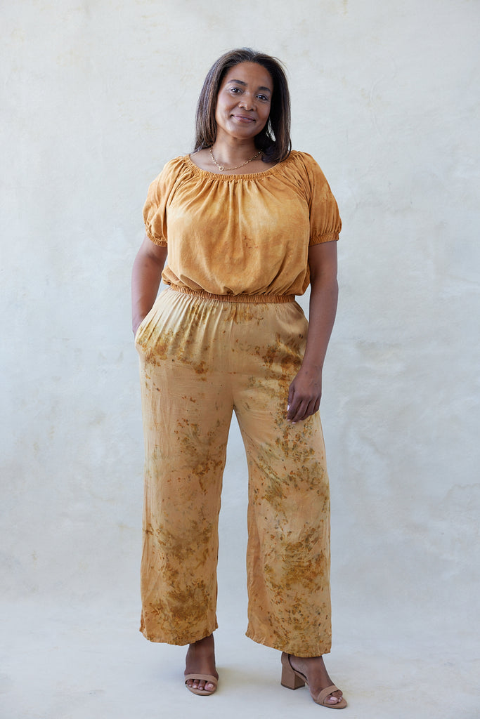 These 100% Silk Charmeuse pants are one of a kind and hand dyed with local coreopsis flowers.