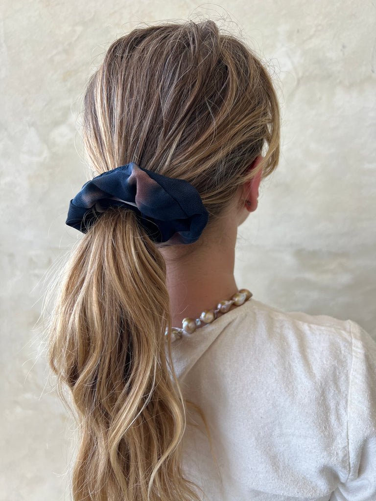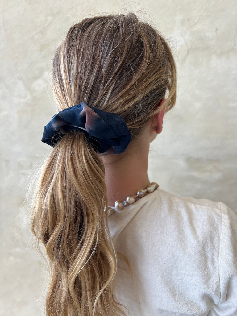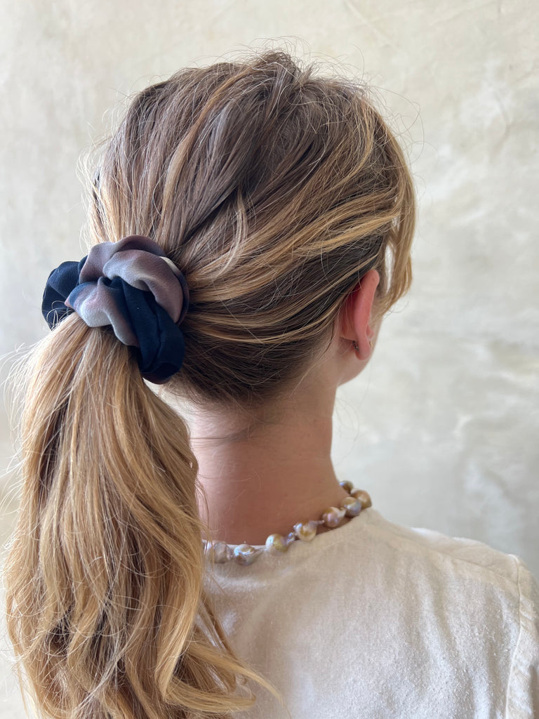 Introducing our luxurious silk scrunchie, lovingly handcrafted and naturally dyed using a blend of oak, iron, and other tannins. The combination of these natural material creates a palette of dark rich blacks and earthy tones that add depth and sophistication to any hairstyle. Embrace sustainability and style with this eco-friendly accessory.