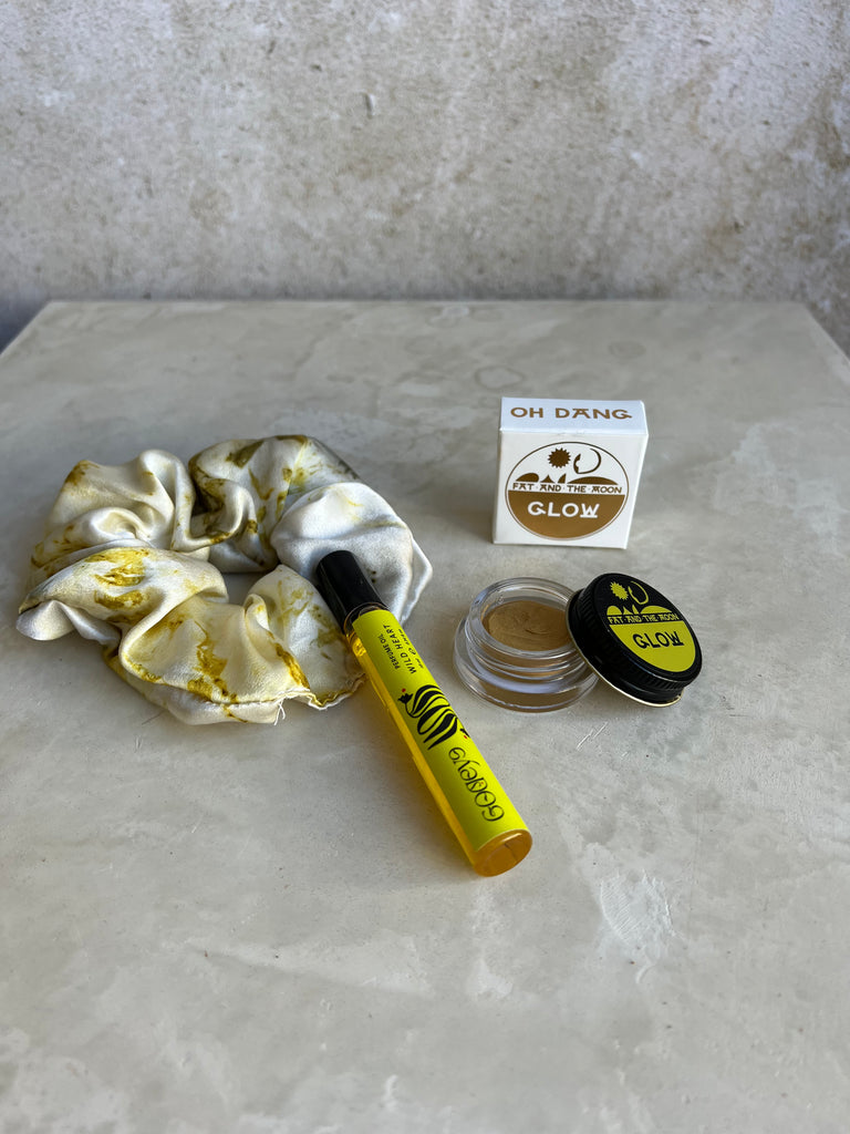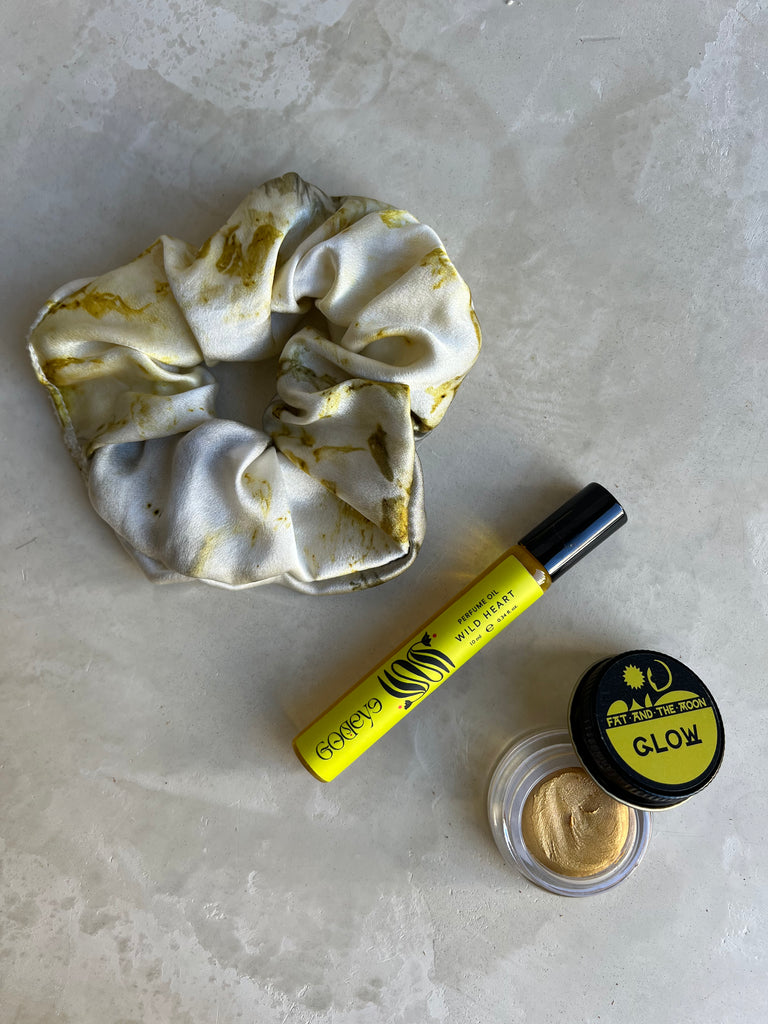 This gift includes a naturally dyed, silk scrunchie, glow eye shimmer by fat in the moon and a lovely role on perfume by gods eye oils. Available in Northstar, Thunder Horse and Wild Heart.